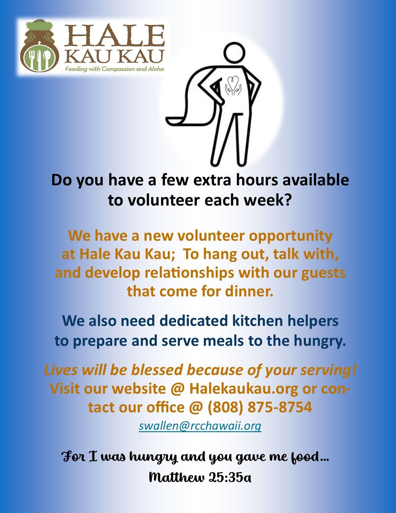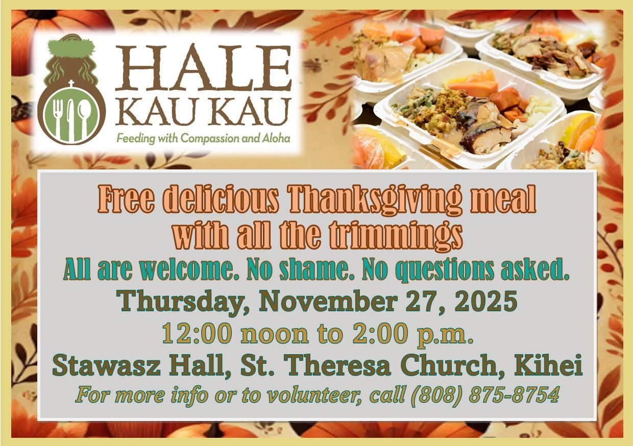 Each day of the week Hale Kau Kau serves a hot meal to the hungry and the needy from our kitchen located at 25 W. Lipoa Street in Kihei. On the property of St. Theresa's church, we welcome as Stewards all those who are in need of a hot, nutritious meal. We offer a wide range of delicious options each day, including an entree, salad, starch, dessert and drink. For the convenience of our diners we have a number of picnic tables available to eat, a sink for washing up, and the good company of all those who join us each day.