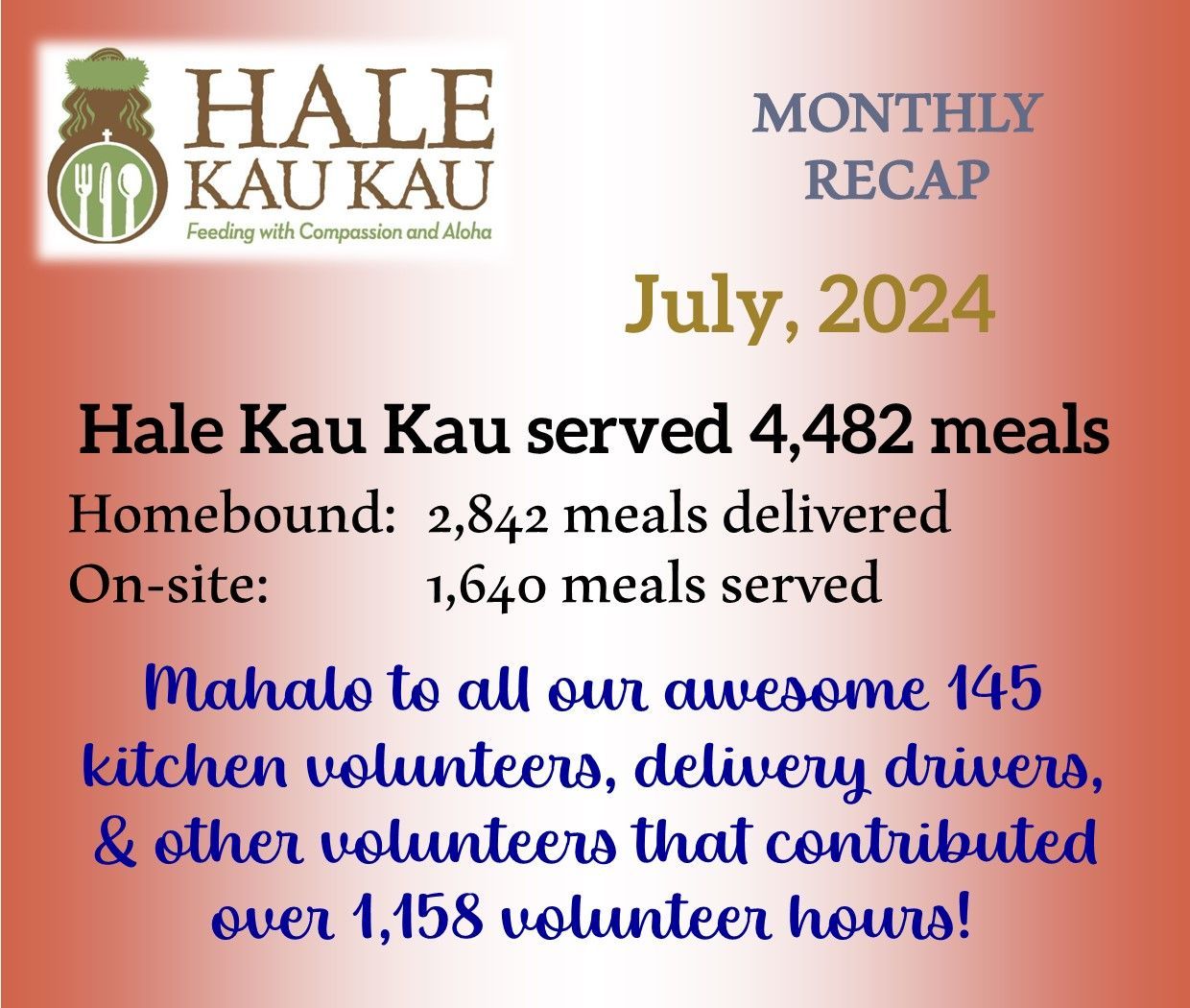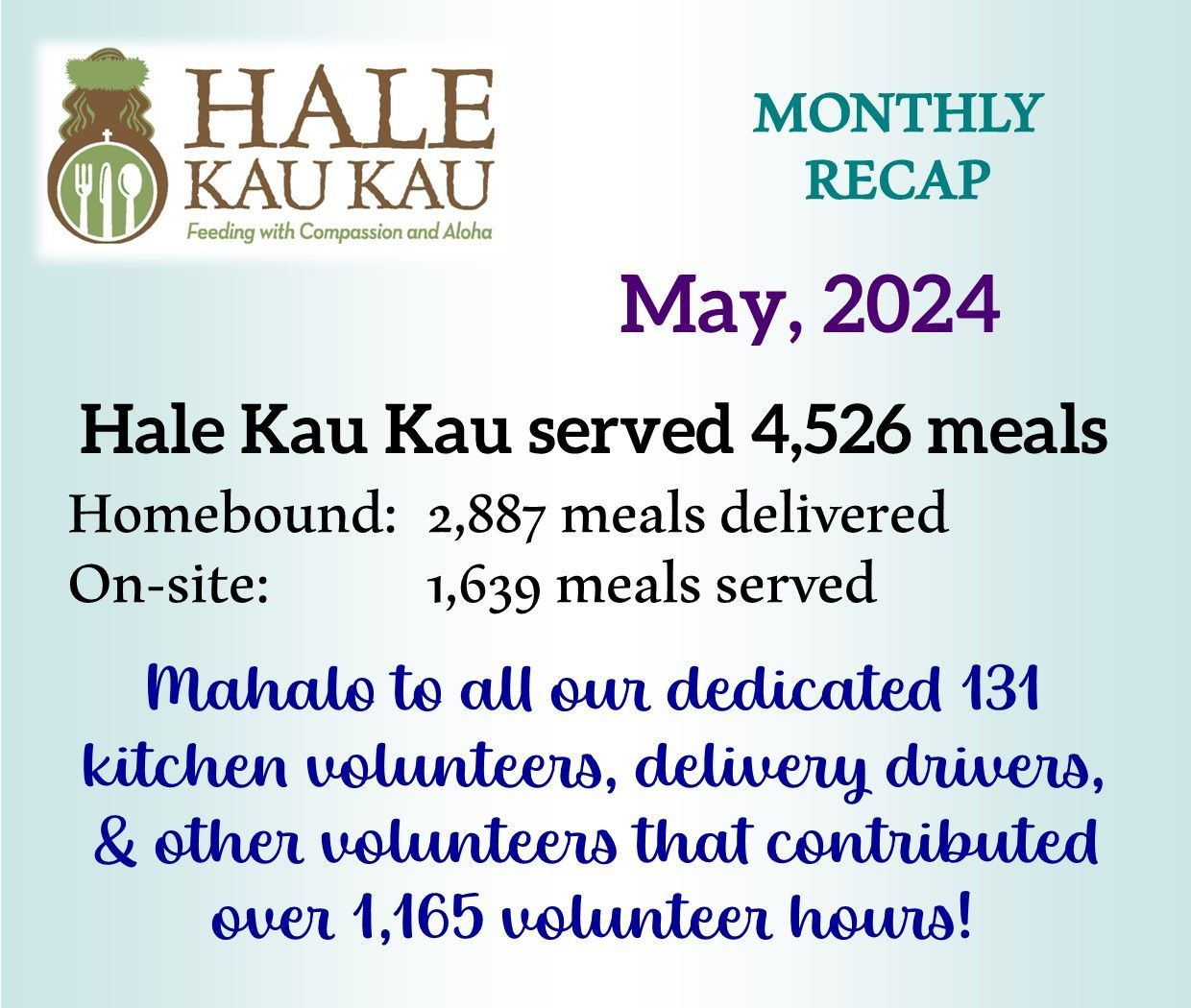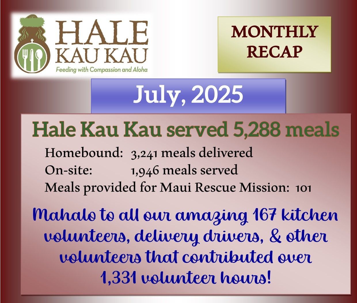 Through the assistance of our volunteer drivers Hale Kau Kau delivers meals each afternoon to our Home Bound residents of South Maui. The meal consists of a hot entree, salad, vegetable, fruit, dessert, a bread, and an additional starch. Each meal is designed to provide approximately 1500 calories and address general nutritional needs.
