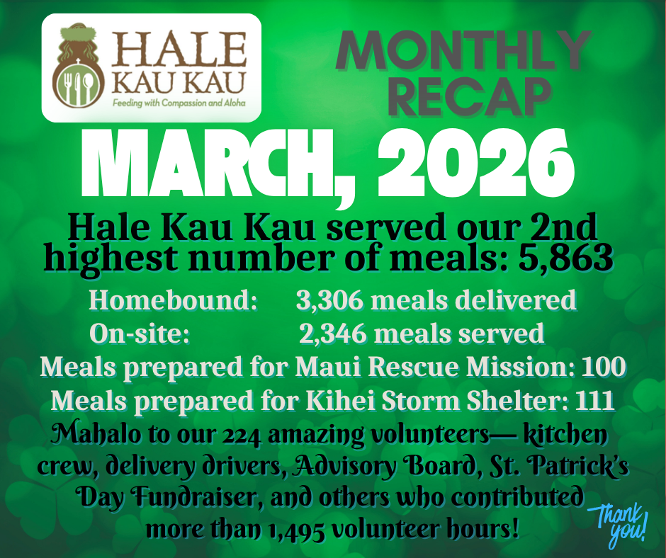 Through the assistance of our volunteer drivers Hale Kau Kau delivers meals each afternoon to our Home Bound residents of South Maui. The meal consists of a hot entree, salad, vegetable, fruit, dessert, a bread, and an additional starch. Each meal is designed to provide approximately 1500 calories and address general nutritional needs.