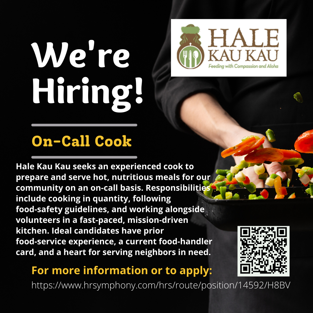 Each day of the week Hale Kau Kau serves a hot meal to the hungry and the needy from our kitchen located at 25 W. Lipoa Street in Kihei. On the property of St. Theresa's church, we welcome as Stewards all those who are in need of a hot, nutritious meal. We offer a wide range of delicious options each day, including an entree, salad, starch, dessert and drink. For the convenience of our diners we have a number of picnic tables available to eat, a sink for washing up, and the good company of all those who join us each day.