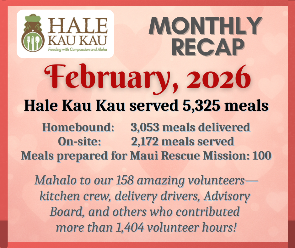 Through the assistance of our volunteer drivers Hale Kau Kau delivers meals each afternoon to our Home Bound residents of South Maui. The meal consists of a hot entree, salad, vegetable, fruit, dessert, a bread, and an additional starch. Each meal is designed to provide approximately 1500 calories and address general nutritional needs.
