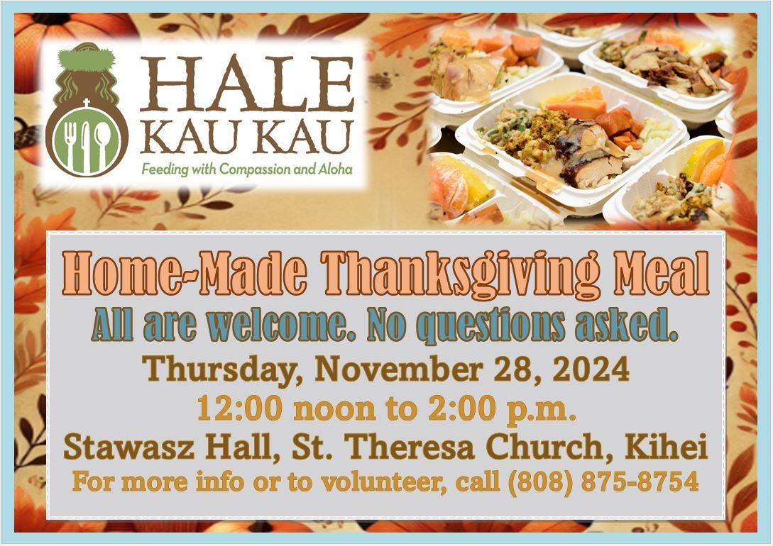 Each day of the week Hale Kau Kau serves a hot meal to the hungry and the needy from our kitchen located at 25 W. Lipoa Street in Kihei. On the property of St. Theresa's church, we welcome as Stewards all those who are in need of a hot, nutritious meal. We offer a wide range of delicious options each day, including an entree, salad, starch, dessert and drink. For the convenience of our diners we have a number of picnic tables available to eat, a sink for washing up, and the good company of all those who join us each day.